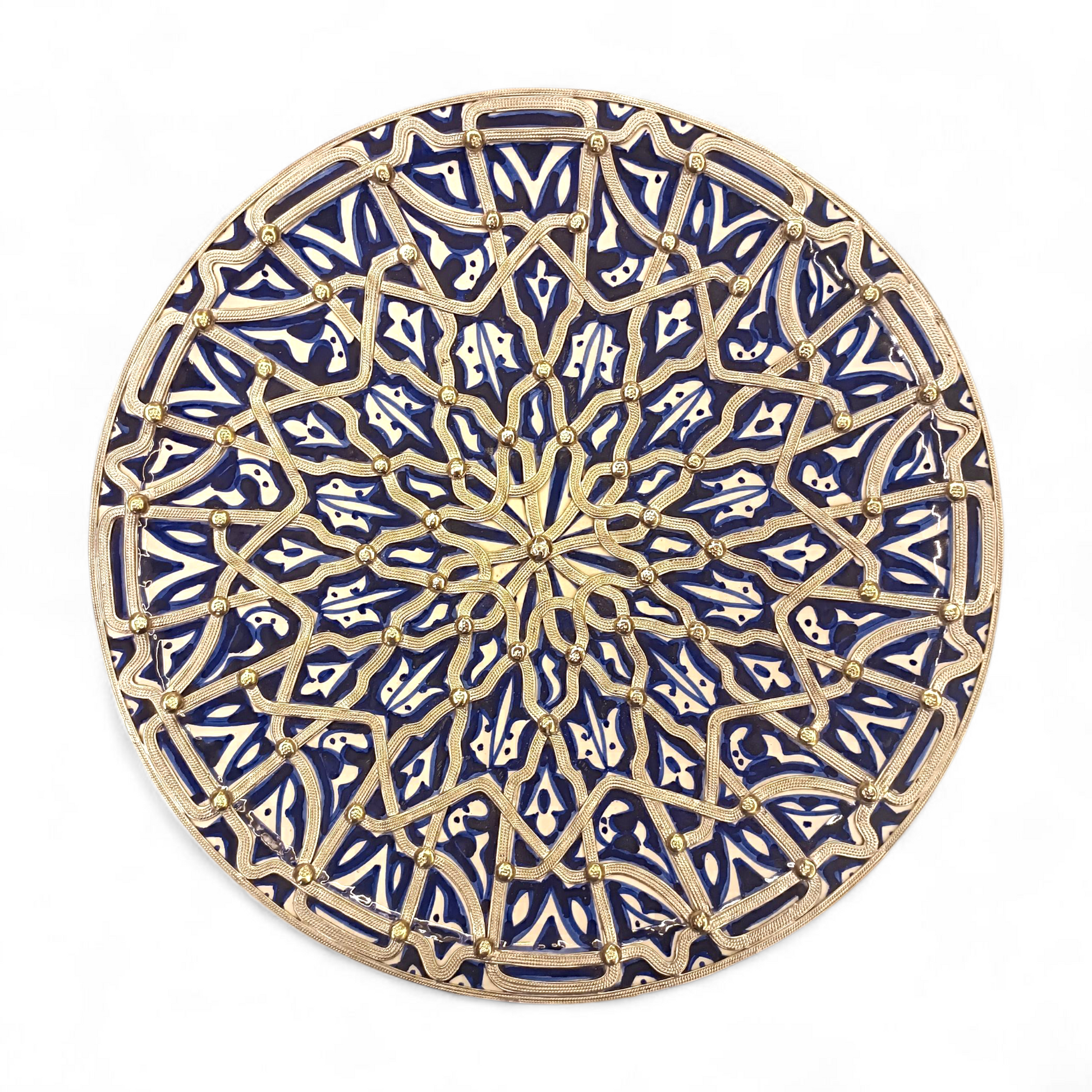 Handcrafted Moroccan Fes Pottery Plate with Nickel Inlay – Blue Ceramic Wall Decor from Fez
