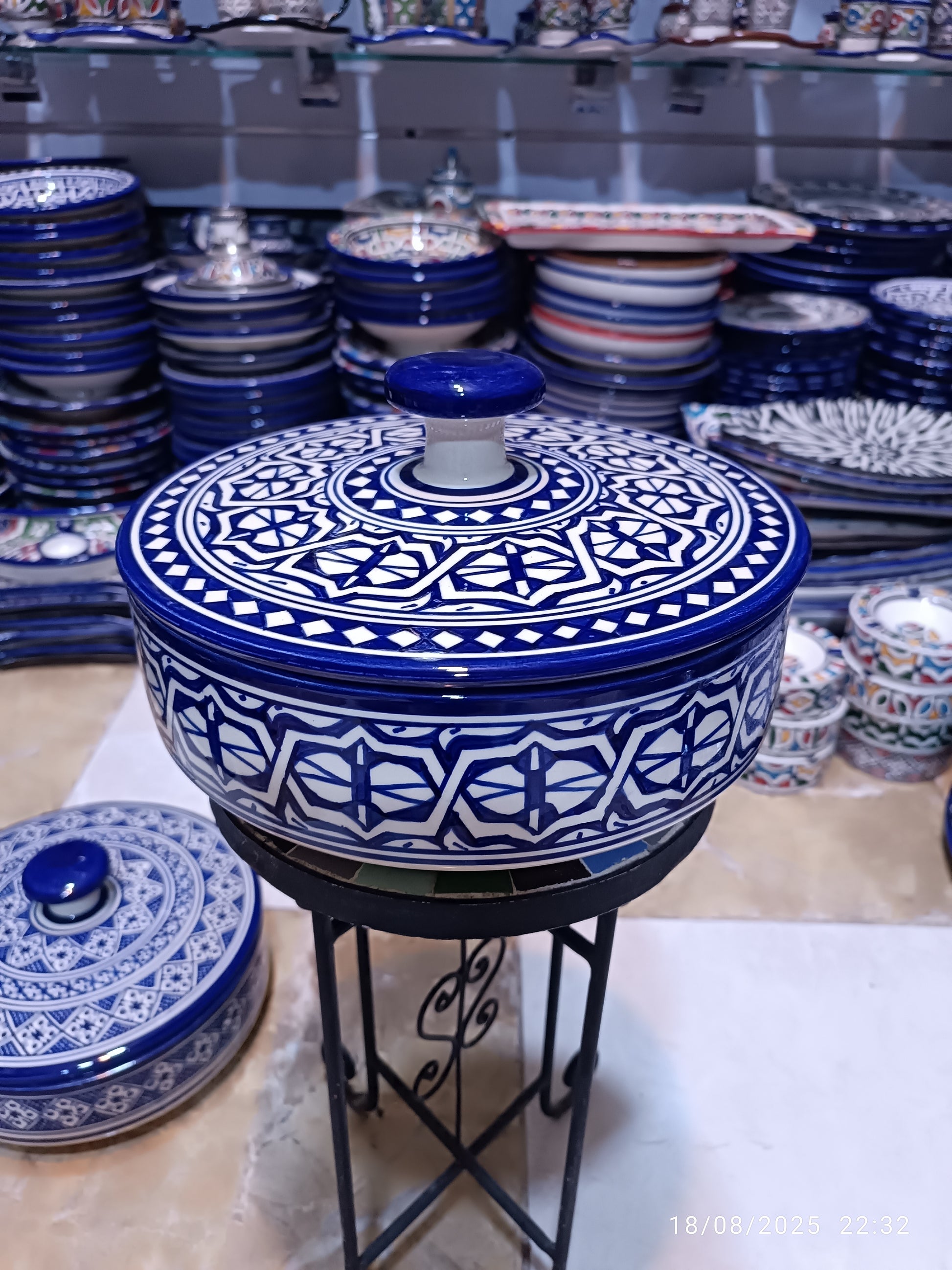 This elegant candy box is handcrafted in Fez, Morocco, and beautifully decorated with traditional Fassi motifs in vibrant blue and white. Meticulously hand-painted by skilled artisans, it measures 23 cm in width and 9 cm in height, making it a practical yet artistic addition to your home. Ideal for serving sweets, storing treats, or simply as a decorative centerpiece, this piece reflects the timeless charm of Moroccan pottery. A unique and refined gift for lovers of fine handmade crafts.