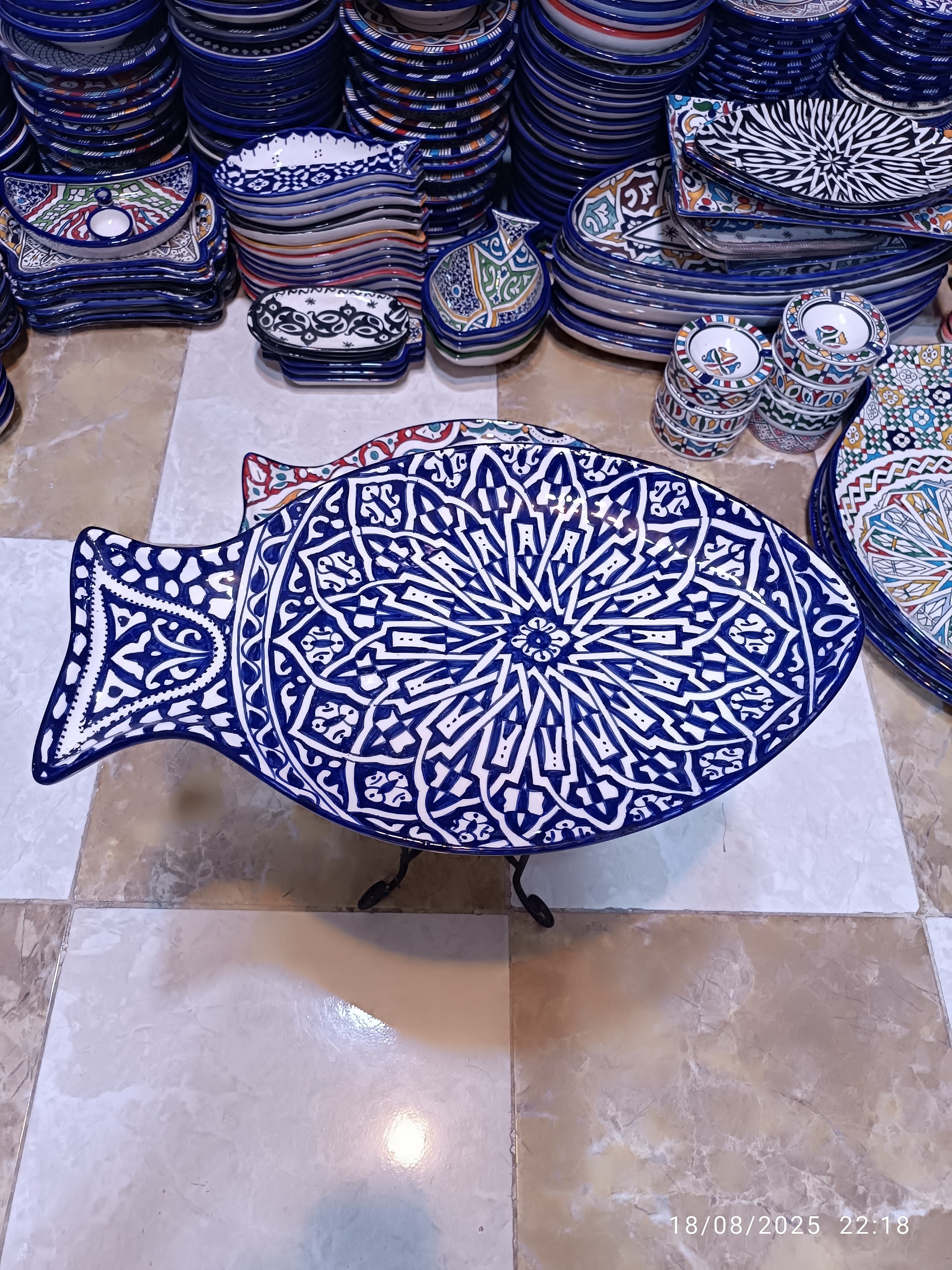 Bring the charm of Fes craftsmanship to your table with this stunning fish-shaped serving platter, handmade and hand-painted by skilled Moroccan artisans. Crafted from authentic Fes pottery, it features intricate traditional motifs inspired by the timeless heritage of the old medina of Fes.