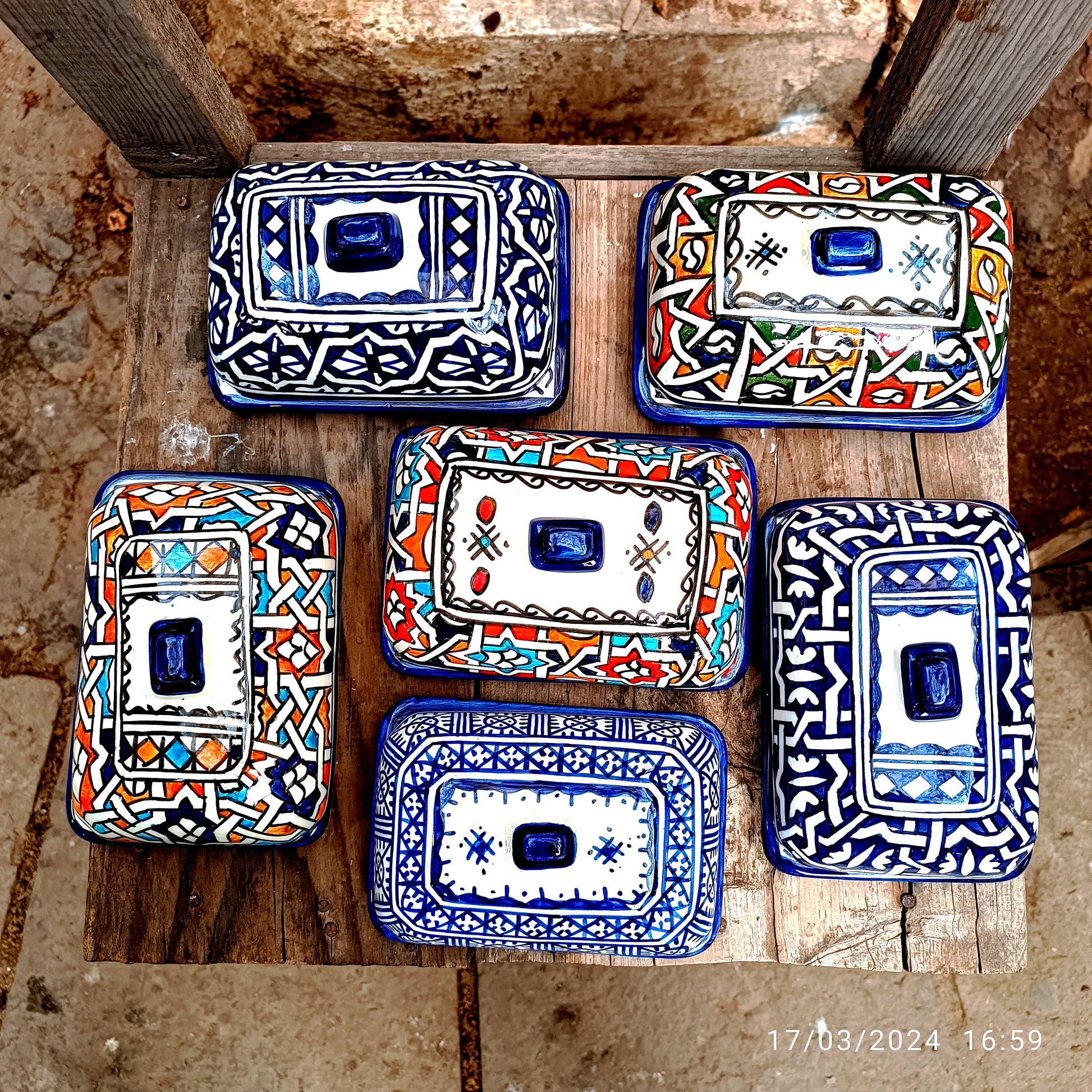 Bring a touch of Moroccan elegance to your table with this handcrafted dish, made from fine white clay and beautifully hand-painted with vibrant geometric patterns inspired by the traditional zellige of Fez. This versatile piece is perfect for serving butter, cheese, or small appetizers, combining functionality with timeless artistic flair. Each dish is a unique expression of Moroccan craftsmanship, making it a stunning addition to any kitchen or dining setting.