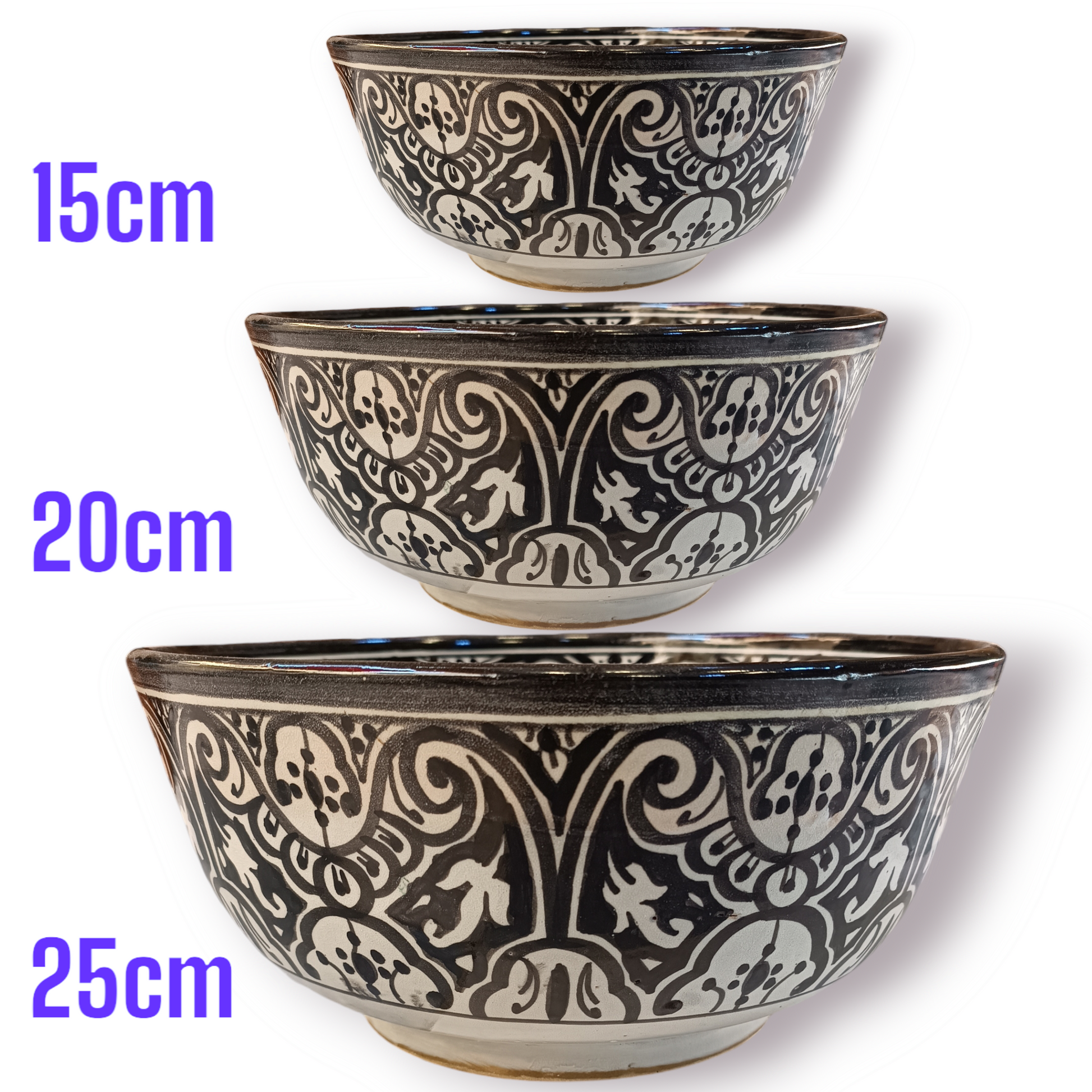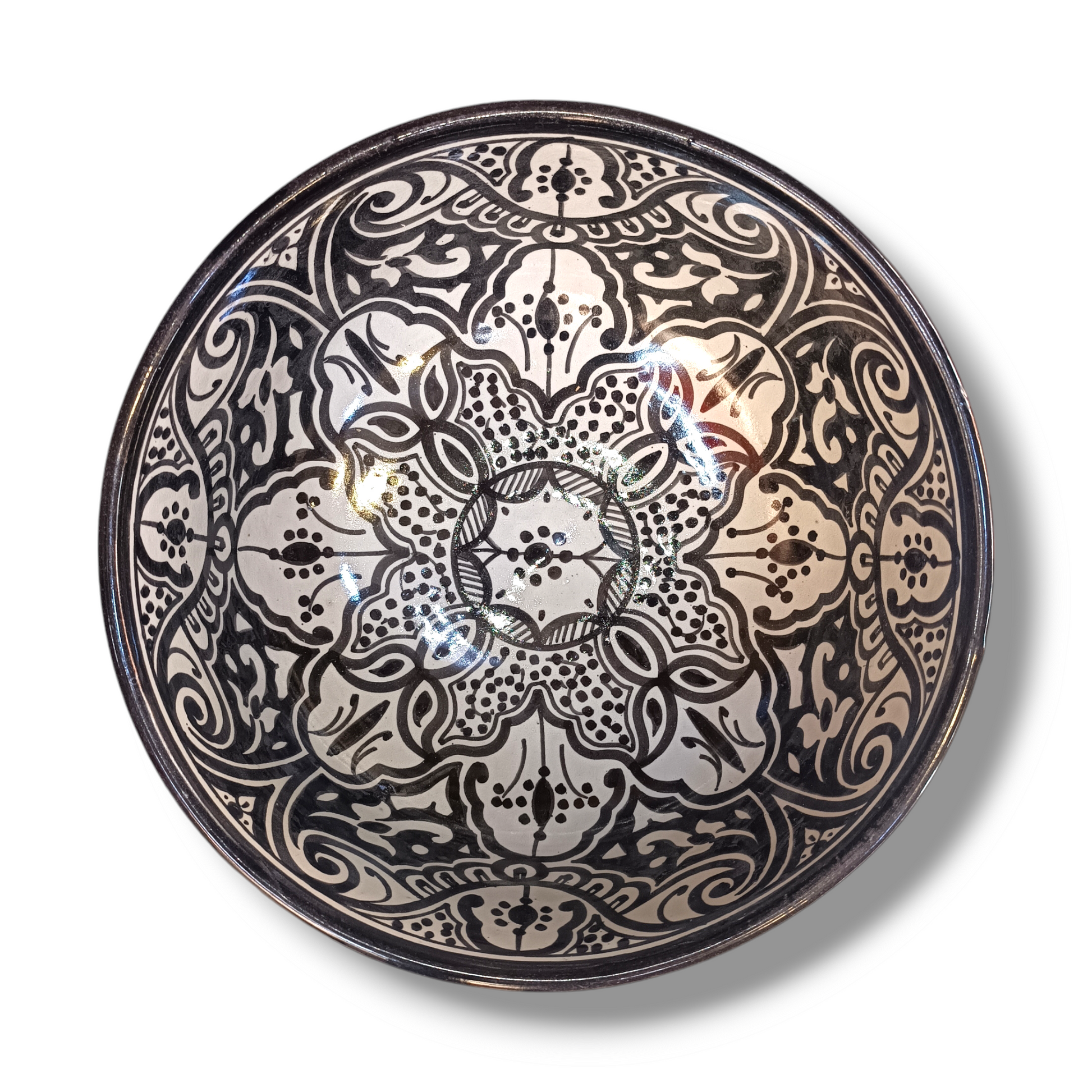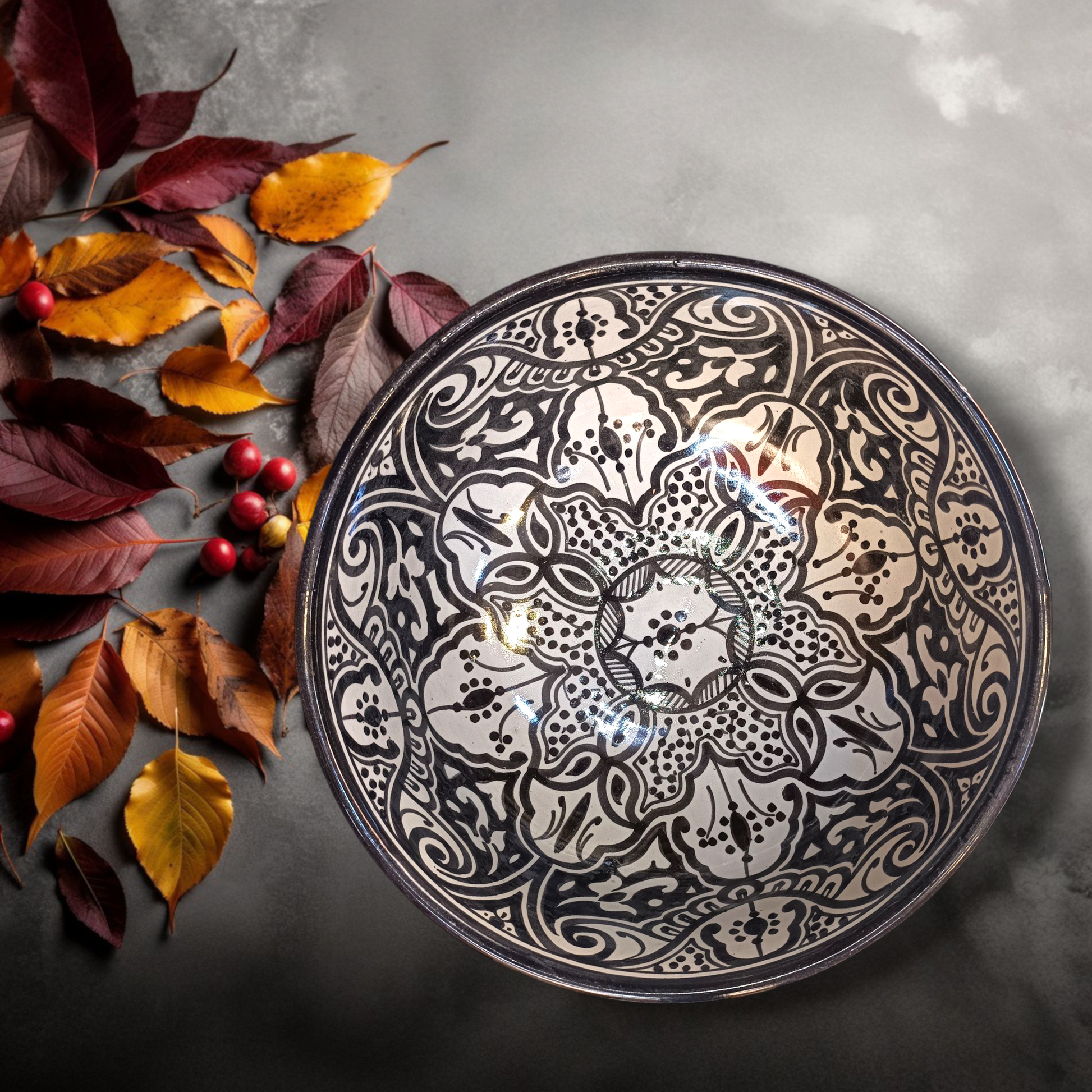 A handcrafted Fez ceramic bowl in refined shades of grey and black, featuring intricate Amazigh (Berber) tattoo-inspired motifs. Its symmetrical ornamental design makes it a striking wall décor piece, with holes on the back for easy hanging. This bowl is 100% lead-free, food-safe, microwave and dishwasher safe—combining authentic Moroccan artistry with modern functionality.
