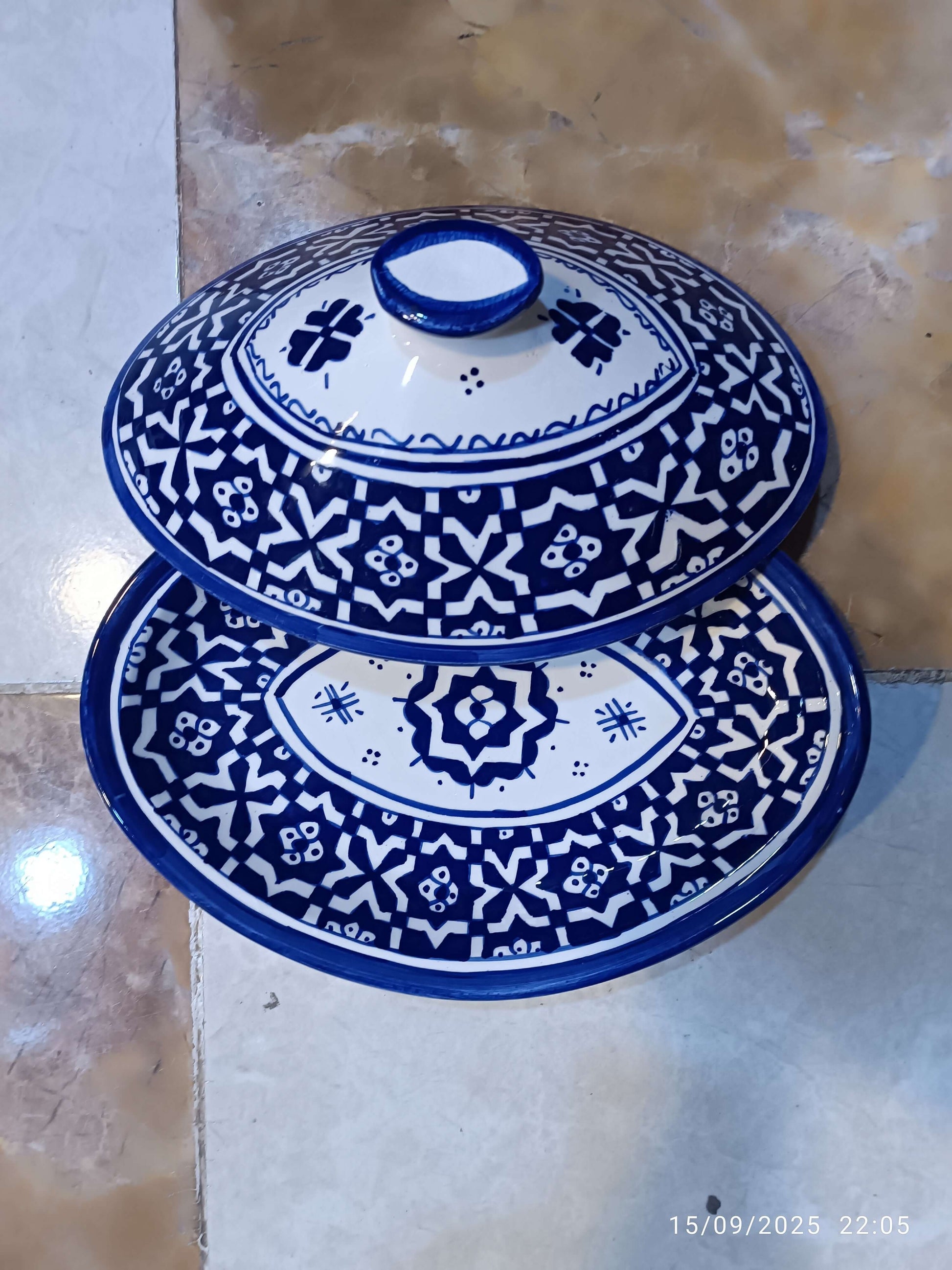 Oval Tagine – Blue & White Geometric Design Handmade Moroccan