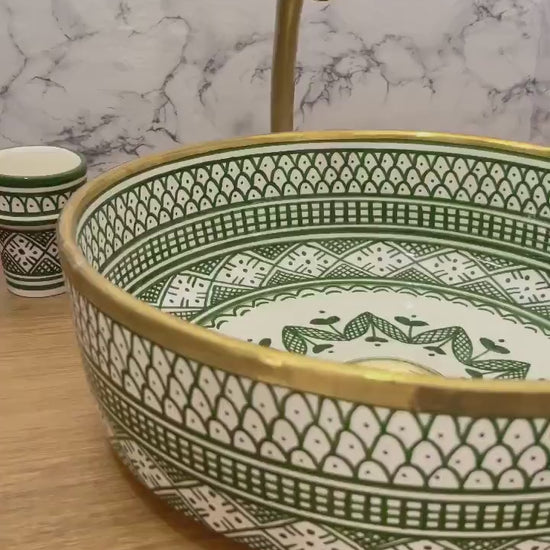 As the morning sunlight streams through the window, casting gentle rays upon the serene oasis of your bathroom, the centerpiece of tranquility captures the eye: the handcrafted ceramic sink with its lush green hues and gleaming brass rim. Nestled atop a sleek vanity, the sink exudes artisanal elegance and timeless charm.