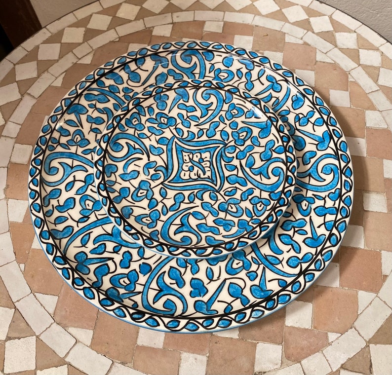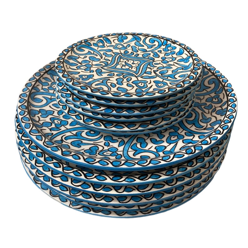 6 Serving plates made of white clay, hand-painted and hand-decorated.