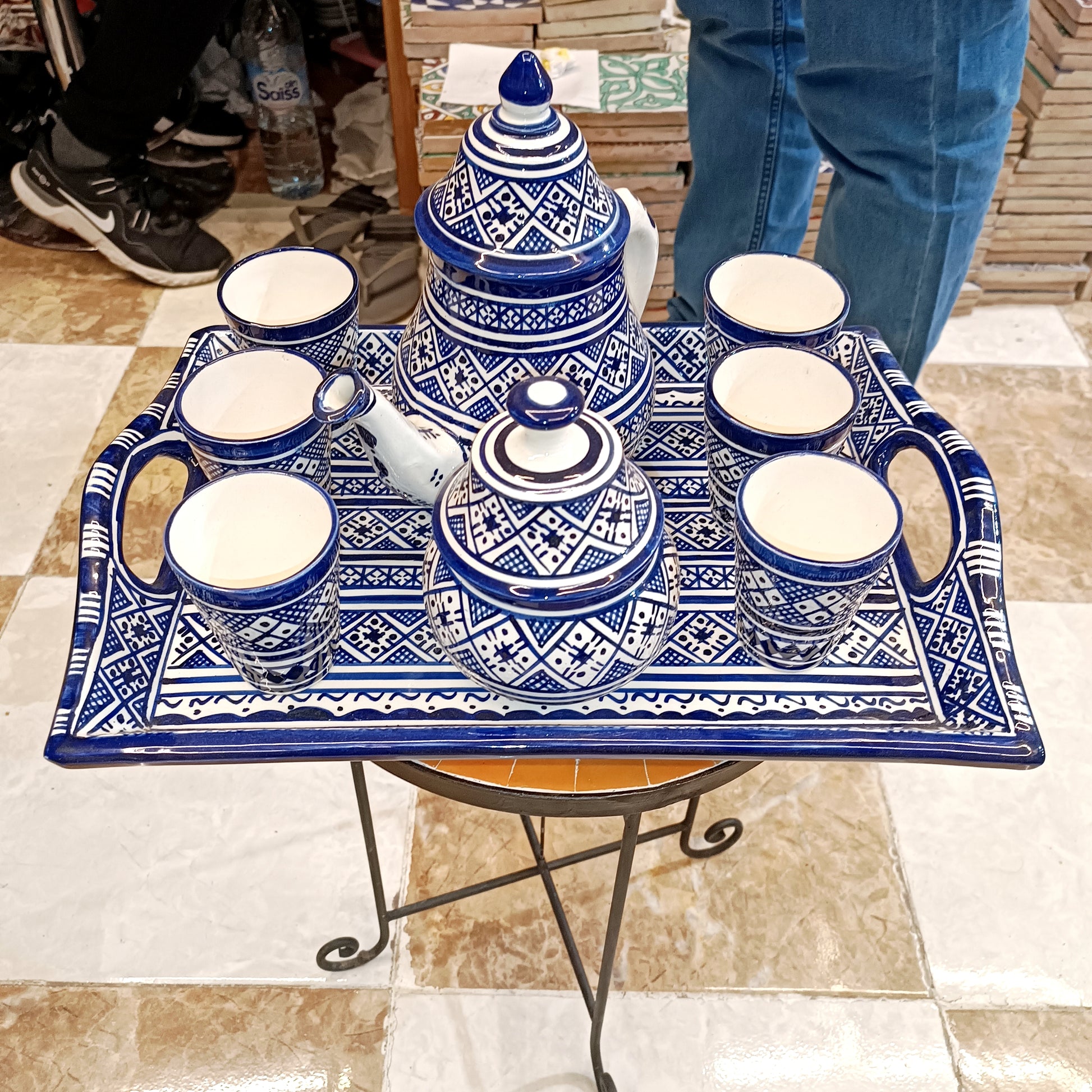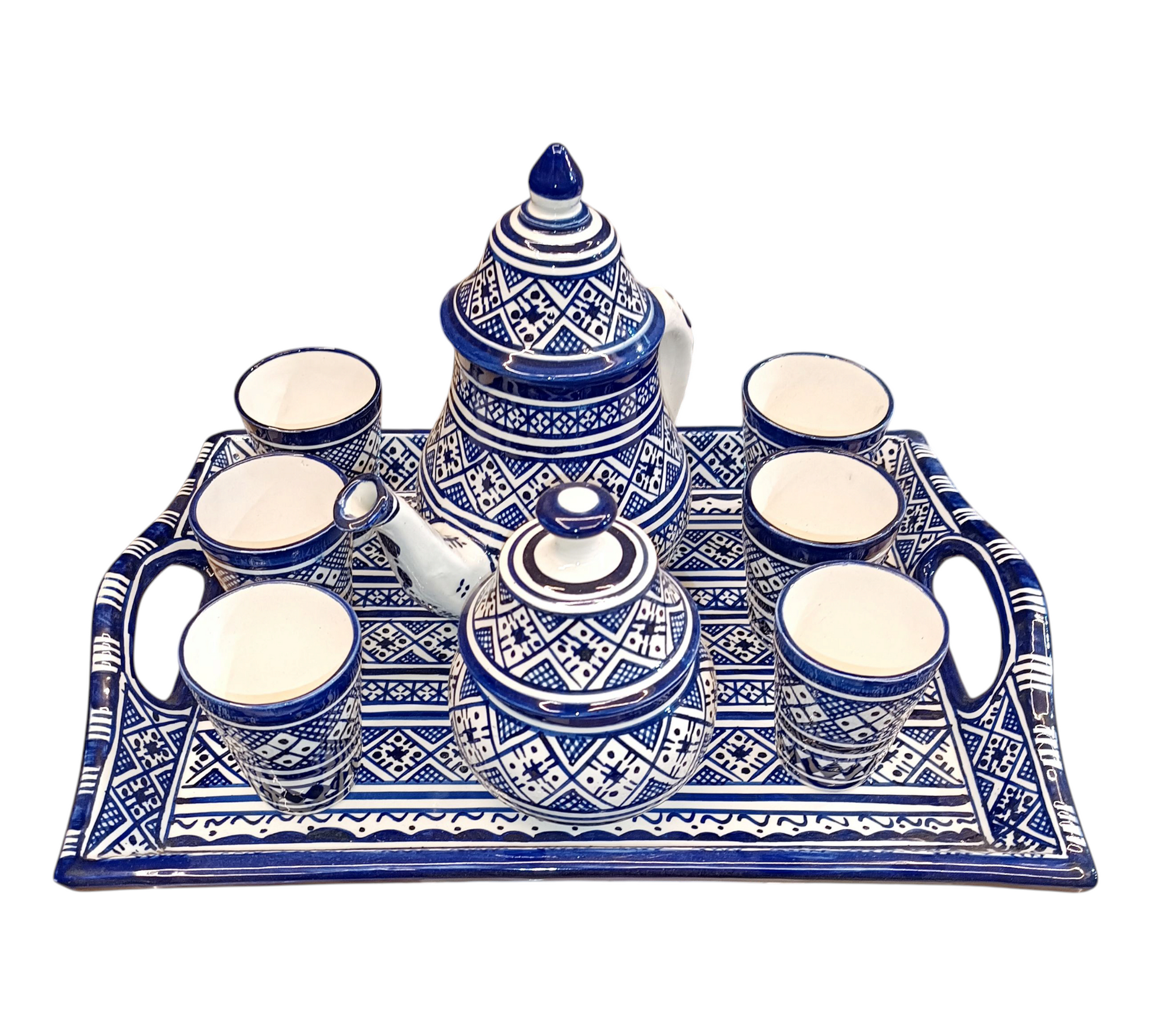 Handcrafted Blue & White Fassi Tea Set – 9-Piece Moroccan Clay Elegance